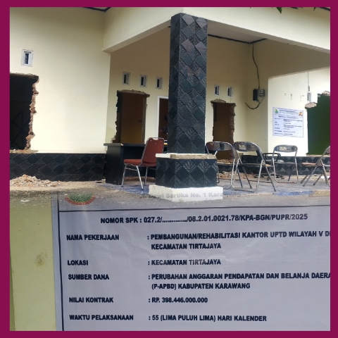 Karawang, www.targethukum.com — Proyek rehabilitasi kantor UPTD Wilayah V DPUPR Tirtajaya, Kabupaten Karawang, kini menuai sorotan tajam dari publik. Pasalnya, pekerjaan yang bersifat rehabilitasi ringan itu justru menghabiskan anggaran fantastis mencapai Rp398.446.000 dengan waktu pelaksanaan hanya 55 hari kalender, dikerjakan oleh CV. Handal Daya Sejahtera.