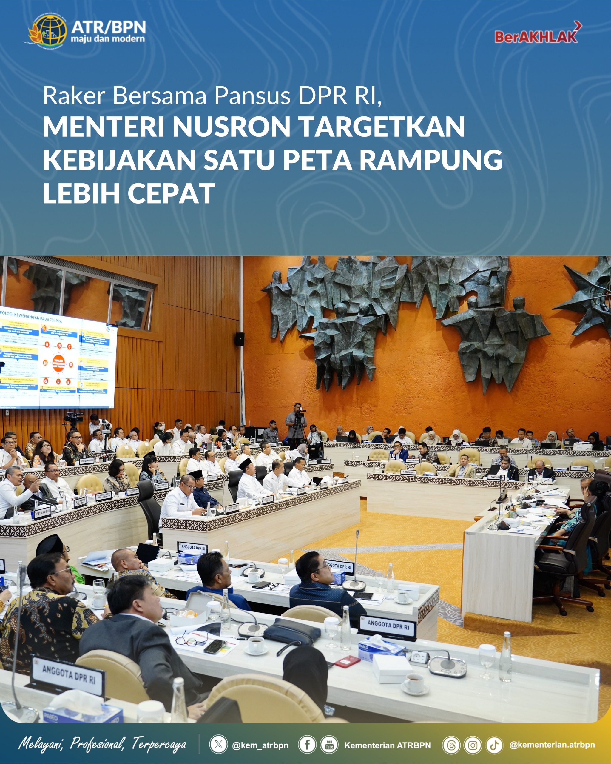 “Kalau bisa sebelum tahun 2028, peta sudah jadi. Ada waktu 2 tahun, kita menyelesaikan masalahnya. Sehingga tahun 2029, sudah tidak ada lagi konflik agaria. Itu legacy kita,” tegas Menteri Nusron di hadapan Wakil Ketua DPR RI, Saan Mustopa, serta seluruh peserta rapat kerja.