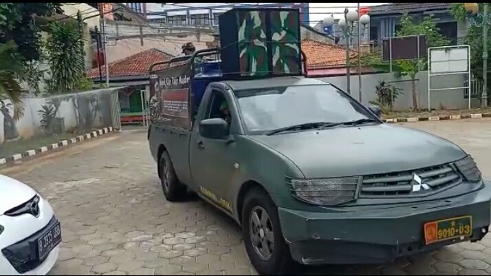 Dengan Kendaraan Dinas ( Randis ) yang dimodifikasi Jet Spraygun Disinfektan 1 Unit dan 2 unit Sprayer Disinfektan Koramil Kebon Jeruk Kodim 0503 Jakarta Barar laksanakan penyemprotan disinfektan.