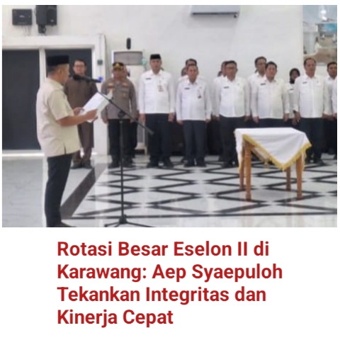 Bupati Karawang, H. Aep Syaepuloh, secara resmi melantik dan mengambil sumpah sejumlah pejabat eselon II dalam agenda rotasi dan mutasi yang digelar di Aula Husni Hamid Pemda Karawang pada Jum’at (14/11/2025).✓Langkah ini diambil sebagai bagian dari upaya penyegaran organisasi serta peningkatan kualitas pelayanan publik di Kabupaten Karawang.