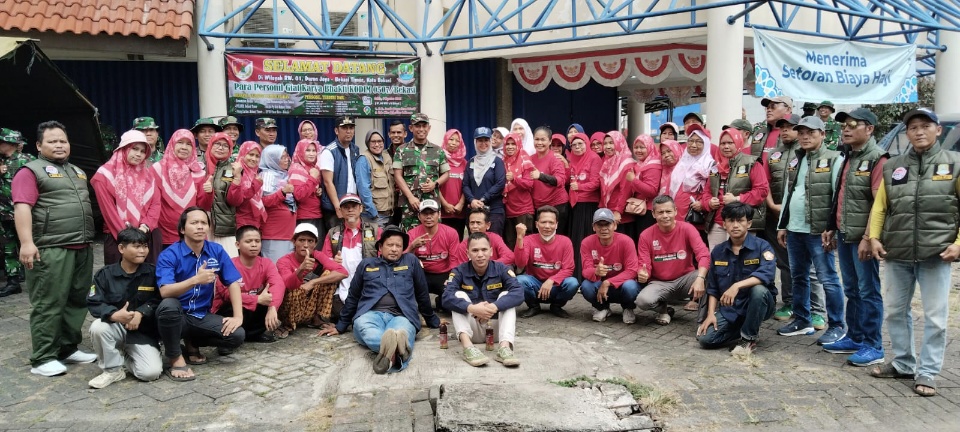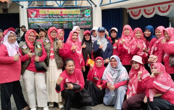 Semangat ibu-ibu PKK RW. 01, kel. Duren Jaya, kec. Bekasi Timur , kota Bekasi yang juga tergabung dalam ibu-ibu majlis Ta’lim Al-Barokah bergaya depan kamera bersama ibu FITRI WIDYATI, S.STP., M.Si (camat Bekasi Timur) usai mengikuti kegiatan Karya Bhakti KODIM 0507/BKS diwilayah sasaran jalan Ir. H. Juanda dan jalan Underpass alias jalan H. Nonon Sonthanie pada sabtu, 9 Agustus 2025.