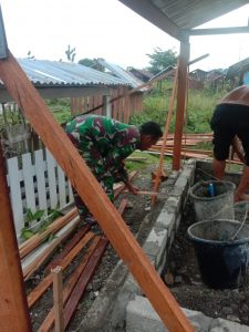 Nabire ,Targethukum.com~ Bertempat di TPU kelurahan Bumiwonorejo Distrik Nabire,Babinsa Koramil 1705-01 /Nabire(Sertu Purwanto) melaksanakan kegiatan membantu pembangunan rumah makam Almarhum Bapak Maks Komolantong.
