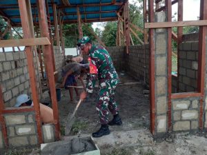 Yapen,Targethukum.com- Sebagai wujud nyata kepedulian TNI dalam meringankan dan mengatasi kesulitan masyarakat di sekelilingnya, Babinsa Koramil 1709-03/Warbah Serda Doddy Bohang membantu pembangunan rumah milik Sarno Sanjaya, warga Kampung Demisa, Distrik Inggerus, Kabupaten Waropen, Minggu (11/07/2021).