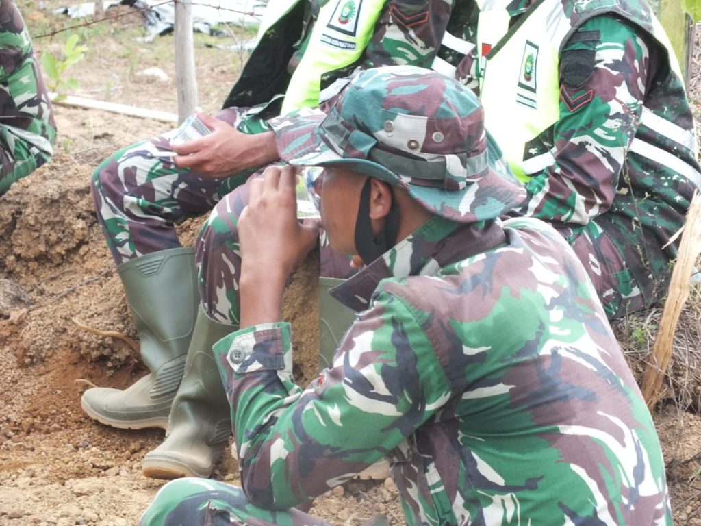 Cuaca terik matahari di lokasi sangat panas serasa membakar kulit dan membuat dahaga yang luar biasa bagi anggota Satgas TMMD Ke 110 Kodim 0318/Natuna, Jumat (5/3/2021).