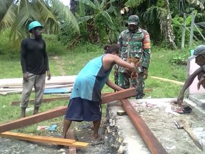 Yapen,Targethukum.com-Selalu berperan aktif dalam membantu masyarakat di wilayah binaannya, merupakan cerminan dari sikap dan kepedulian seorang Babinsa sebagai aparat teritorial. Seperti halnya yang dilakukan oleh Babinsa Koramil 1709-01/Yapsel Serda Musa Yarollo, yang terjun langsung membantu proses renovasi teras rumah milik Matias Songgini, warga Kampung Kamanap, Distrik Kosiwo, Kab. Kep. Yapen, Papua. Kamis (01/04/2021).