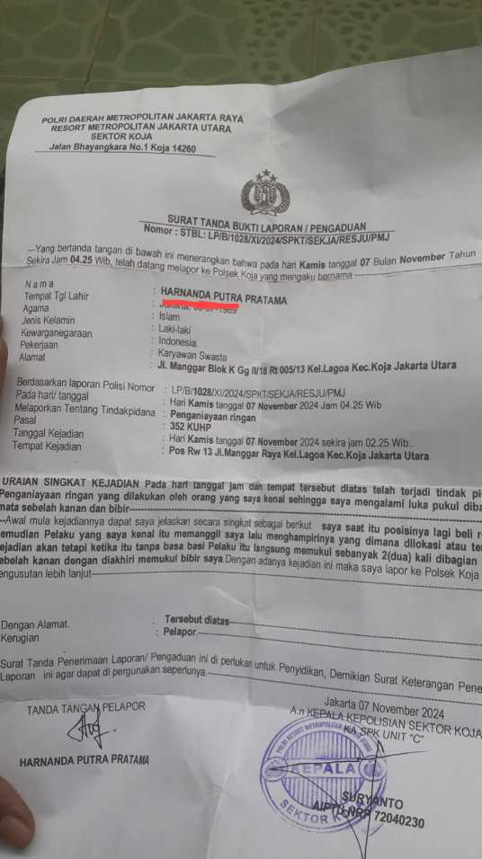 Banyak saksi yang melihat kejadian tersebut, bahkan LINMAS setempat sempat mencoba melerai keributan, akan tetapi justru LINMAS pun hampir menjadi sasaran, serta alat keamanan (tongkat) coba direbut oleh pelaku. Nanda yang juga menjabat sebagai Bendahara RW.013, kel.Koja- Jakarta Utara akhirnya melaporkan hal ini kepihak berwajib yakni POLSEK KOJA-Jakarta Utara dengan nomor LP/B/1028/XI/2024/SPKT/SEKJA/RESJU/PMJ untuk meminta keadilan.