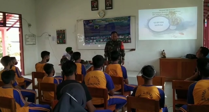 Acara dilaksanakan di salah satu ruangan SMP Negeri 2 Satap Tng balau, Sabtu (20/3/2021). Sebagai narasumber dalam kegiatan ini yakni Babinsa Dpp Serka Parsimin, Koramil 06/Serasan, yang juga anggota satgas TMMD dan juga di hadiri Guru Pembimbing, beserta 45 Siswa.