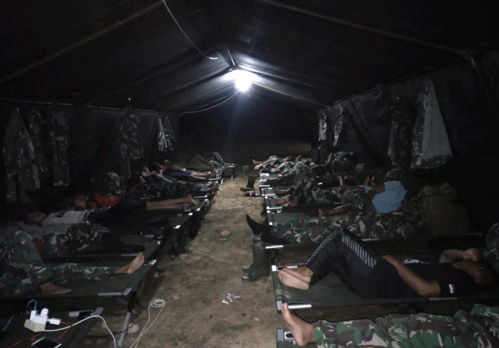 Guna persiapan menjelang kungker Pangdam 1/Bukit Barisan Mayjen TNI Hassanudin S.I.P., MM ke Lokasi TMMD Dusun Sebayar Desa Sungai Ulu Kec. Bunguran, Satgas TMMD Ke-110 Kodim 0318/Natuna, tidur di tenda selama kegiatan.