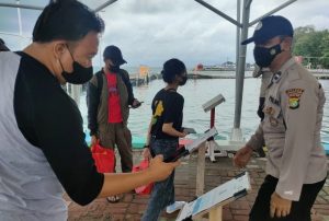 Sejumlah Seratus Dua Puluh Empat warga dan wisatawan tiba di wilayah Kepulauan Seribu Utara mendapat pengawasan ketat aturan protokol kesehatan oleh Personel Polsek Kepulauan Seribu Utara di Empat Dermaga Kedatangan, Jumat (10/12).