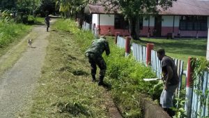 Yapen,Targethukum.com-Sebagai bentuk kepedulian terhadap kebersihan lingkungan desa binaannya, Babinsa Koramil 1709-02/Yaptim Serda M. Christian Ganda Saputra bersama dengan warga binaan, melaksanakan karya bakti dalam rangka pembersihan lingkungan di Kampung Mereruni, Distrik Yapen Timur, Kab. Kep. Yapen, Sabtu (12/06/2021).
