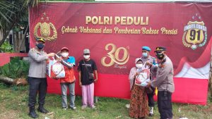 DEPOK, Alumni Akademi Polisi (Akpol Bhara Daksa 91) melalui Polsek Sawangan memberikan bansos kepada warga yang usai divaksin di Joglo LPM, Kelurahan Bojongsari Baru, Kecamatan Bojongsari, Kota Depok, Sabtu (31/7/2021) pagi.