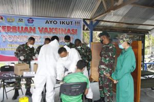 Nabire, Targethukum.com-Dalam Rangka Mensukseskan program pemerintah untuk melaksanakan Serbuan Vaksin Nasional 2021, untuk mengurangi lonjakan kasus Covid-19 yang semakin melonjak setiap harinya di Indonesia, Yonif RK 753/AVT melaksanakan pemberian Vaksin Covid-19 kepada masyarakat diwilayah Nabire,