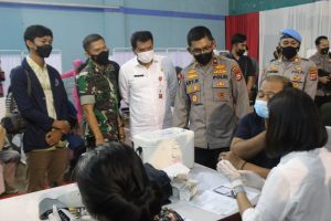 Sementara Wakapolda Banten memberikan Penghargaan kepada anggota Polresta Tangerang Sebagai Peserta Pendonor Darah terbanyak dilanjutkan menyerahkan Bantuan Sosial Secara simbolis kepada Peserta Vaksinasi.