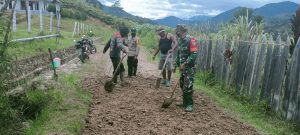 Mapia,Targethukum.com ~ Bertempat di jalan menuju Gereja GKI Bj. Agape Mapia Distrik Mapia Kab.Dogiyai. Babinsa Kampung Bomomani(Sertu Yutrawanto) bersama Bhabinkamtibmas Polsek Mapia (Briptu Irvin Sanaki) bersama warga jemaat GKI Bj. Agape Mapia melaksanakan karya bakti penimbunan jalan dan pemerataan timbunan dari bantuan PT. Dewa Krisna. Guna mendukung program pembangunan Gereja di GKI Bj. Agape Mapia, Rabu (14/4/21).